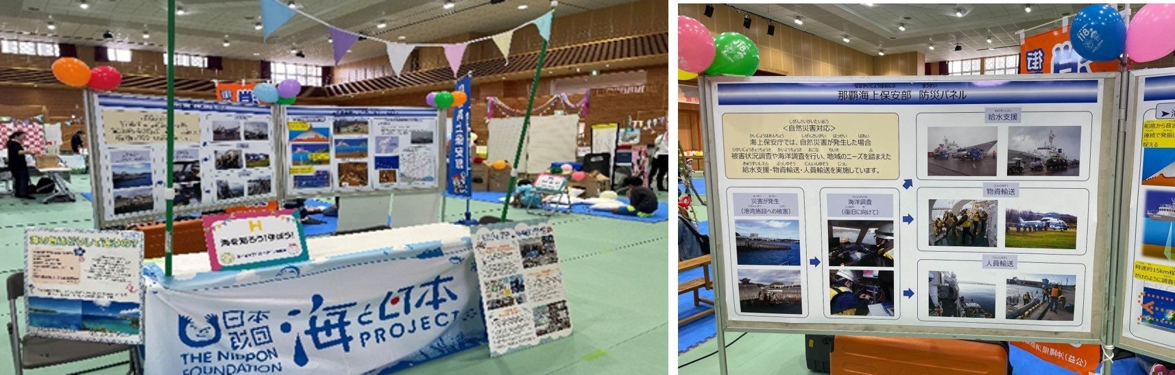 「海の防災って何だろう?」自然災害は、突然発生する自然現象であり、時に地域社会に影響をもたらすことがあります。海と日本PROJECTin沖縄県のブースでは、那覇海上保安部の協力のもと,海の防災展示や活動紹介を行い、海上保安庁が行なっている自然災害が発生した場合の被害状況調査や、海洋調査、地域のニーズを踏まえた給水支援・物資輸送・人員輸送を行っている取組みについて来場者へ周知を行いました。