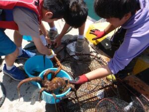 引き上げたかごには、いつも入っているガシラやホウボウなどの根魚以外に、今回はワタリガニや台湾かになども入っていたので子どもたちは大喜びでした。かにを青いバケツで運んで水槽に入れ、観察したり触ったりして生き物観察を楽しみました。この日の一番人気はかにでした。あと驚きと悲しい話は海鵜がかごに入ってしまって息絶えていたことです。海鵜は海に沈んでいくので、子どもたちと手を合わせて海へ戻しました。様々な感情があったと思いますが、これも生き物観察会での学びだと思います。