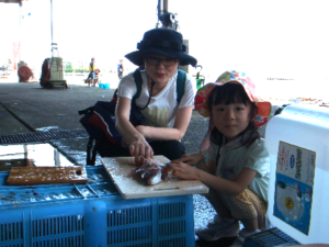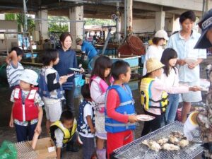今回も魚釣り、仕掛けたかごを引き上げたあと、魚の調理教室を開催しました。スタッフも2年目となり作業場所、包丁、まな板などの設置も手際よく準備してくれます。小さな子どもはうろこ取り、小学生以上の子どもは活きたさかなの締め方とさばき方を教わります。こちらも人気のプログラムなので、大人も魚の締め方やさばき方を経験したいようですが、順番がなかなか回ってこなくて、毎回子どもたちだけでやり遂げてくれます。市場内はたくさんの生け簀や大量の海水を流すことができ、魚のうろこやアラが飛び散っても簡単に洗い流せるので、思い切った活動ができます。土曜日は漁も市場も休みなので、この場所を自由に使わせてもらえることはとても有り難いことです。調理して切った魚はバットに入れて、BBQコンロ2台の焼き場まで運んで、塩焼きにして食べました。