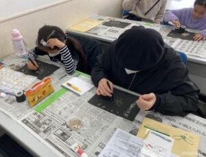 選り分けたチリモンは、『ぼくの・わたしのチリメンモンスター』と題した台紙に気に入ったチリモンを貼り付けたり、今後も残したい思い思いの自分だけの楽しい里海を作って持ち帰っていただきました。