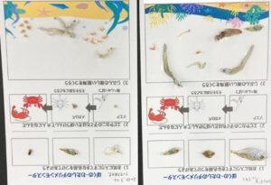 チリモンさがしの後半は、小さなチリモンたちも海の生態系ピラミッドによる『食物連鎖』の立派な構成員であり不可欠な存在であることを伝えました。大阪湾の生きものの繋がりの一部である私たちが使った水やごみが湾に流れ込み海底を汚していることで、特にエビ・カニ・貝の漁獲量が減っている状況にあります。仲間を守っていくために何ができるかを考えるきっかけにしていただきました。