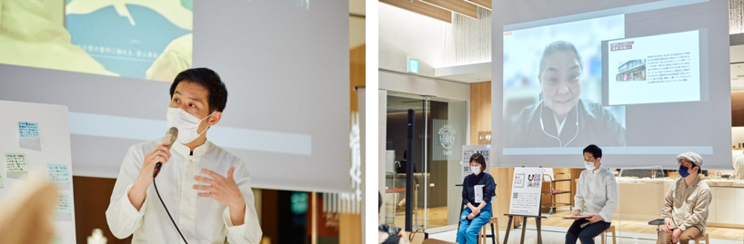 前半は、大分県日田出身の八雲茶寮総料理長でFOOD NIPPON代表の梅原陣之輔さんによるお料理「里山里海をテーマにしたショートコース」を来場者に提供しました。さらに大分県佐伯市に創業され今年333年を迎えた「糀屋本店」の浅利妙峰さんにオンラインでご登壇いただき、梅原さんと共に海にまつわるトークセッションを展開しました。