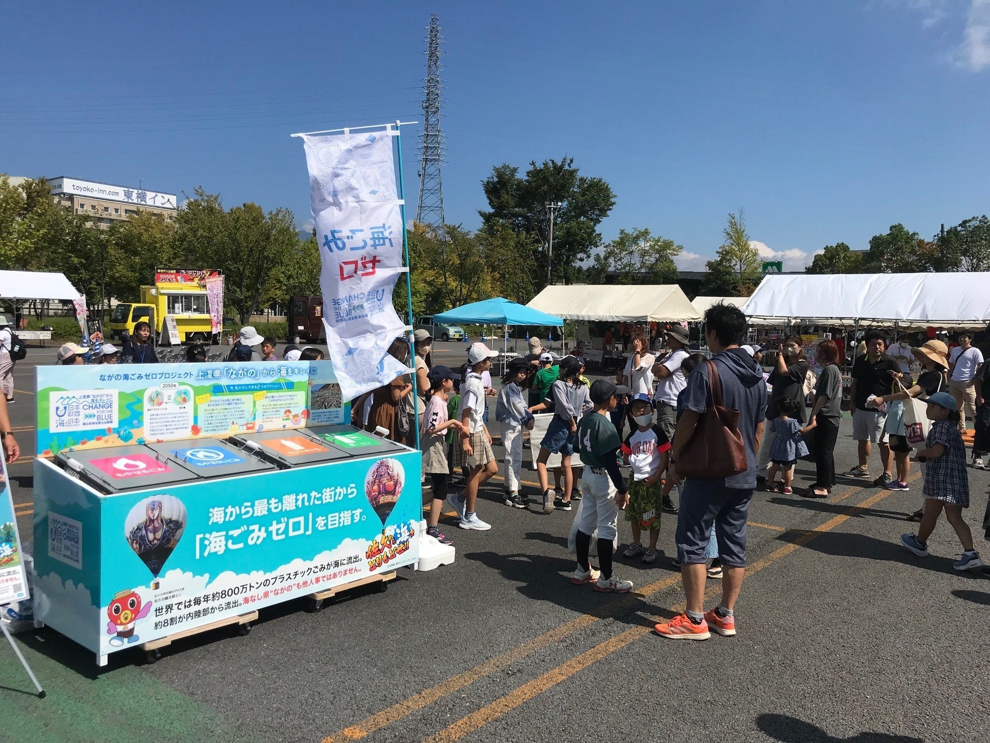 イオンモール佐久平駐車場の一角にイベント会場を設け、ながの海ごみゼロプロジェクトのPRブースならびにモールの各店舗がブースを出展。環境美化に対する取組みや、”海から一番遠い地点が存在する佐久市”から、海洋ごみを減らすために出来るアクションについて、来場者へ発信しました。
