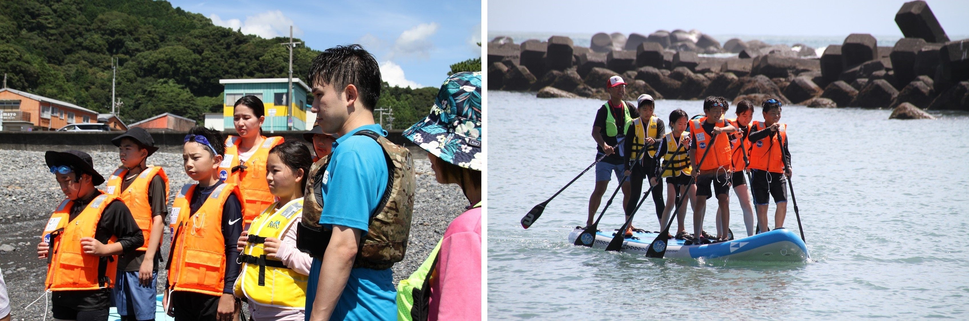 3日目は用宗の海でSUPを楽しみました。初めに、海で安全に楽しく遊ぶために、海の持つ危険性と、ライフジャケットの重要性をしっかりと学習しました。特に夏は水難事故のニュースも多いため、小学生もスタッフもインストラクターさんの話を真剣に聞いて準備しました。