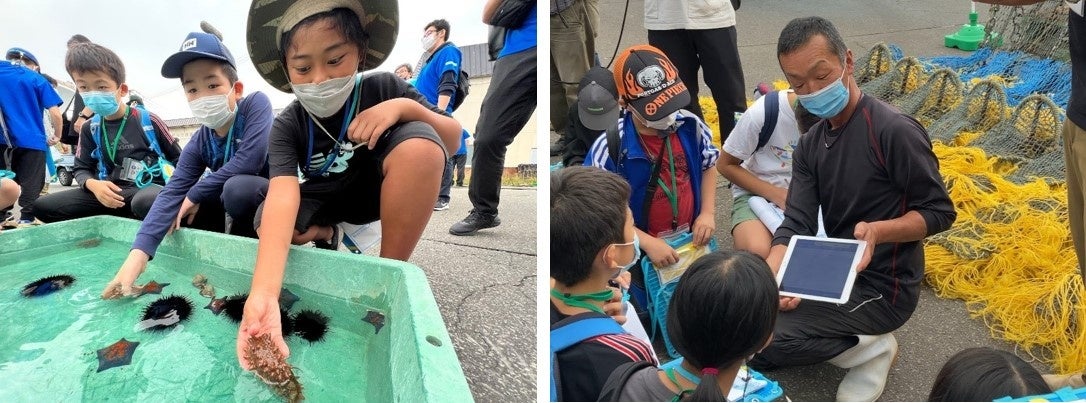 1cmほどの赤ちゃんを見た子どもたちからは、「かわいい!」という声が。ナマコの変態、増殖について学んだ後、ナマコのタッチプールも体験。「見た目よりもずっとムニムニしてる」「ペットにしたい」などの声が上がっていました。