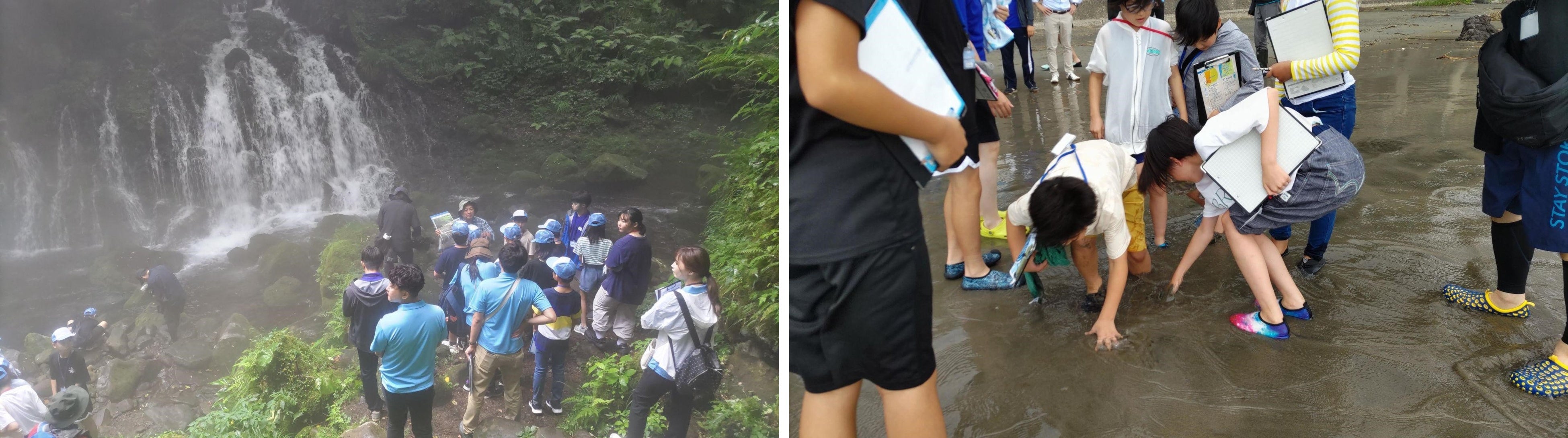 まず「あきたアワビ調査隊」が向かったのは、鳥海山の麓にある「元滝伏流水」です。鳥海山・飛島ジオパークガイドの会のガイドから、鳥海山が60万年前から噴火が始まりその後幾度となく噴火して山が形成されたことや、その溶岩の地層に雪解け水や雨水が溜まり15年ほどの年月をかけて湧き出ていることを学びました。伏流水を実際に触ると「冷たい」や「長い時間触っていられない」などの声が聞かれました。
