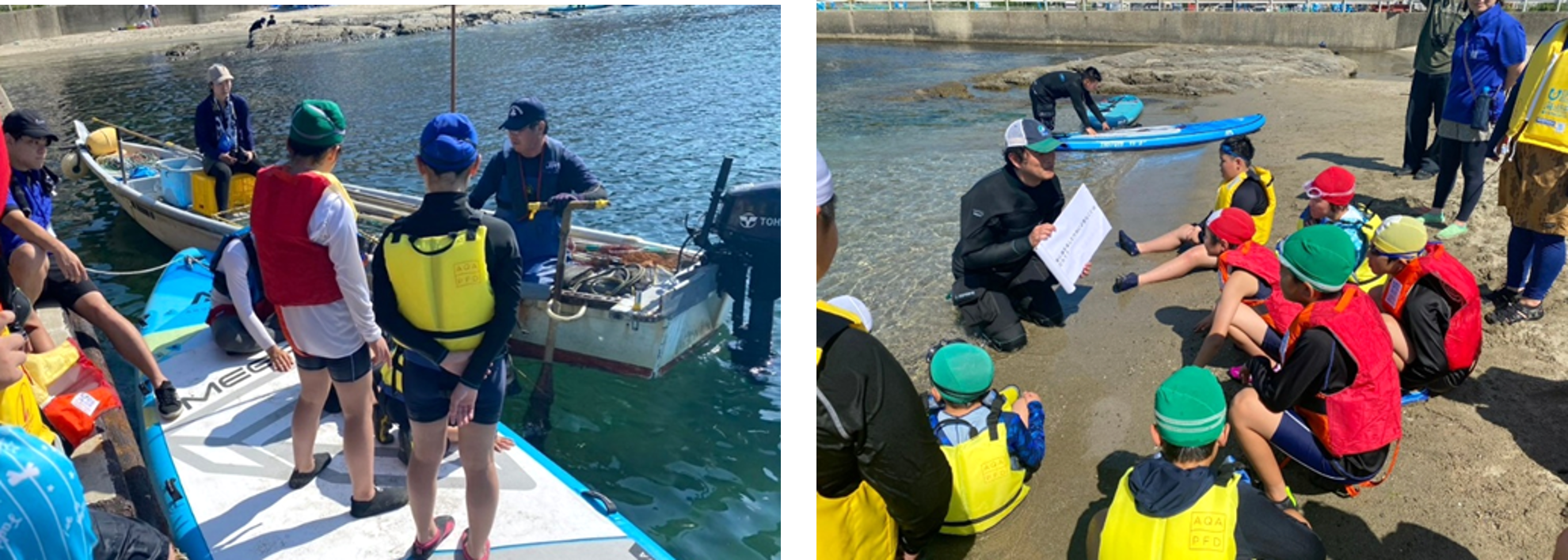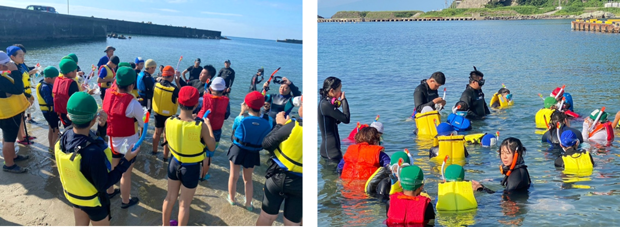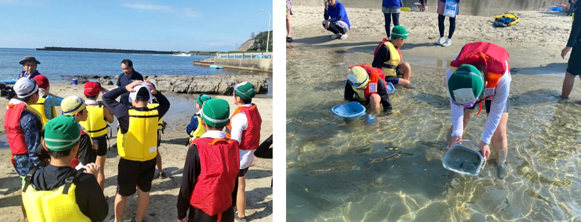 加茂水産高校ダイビング部の補助と渚の交番カモンマーレと連携して、シュノーケリング体験を行いました。海洋環境の変化によって起こっているビーチ付近での影響や、ダイビング部の学生が学んでいること、沖の海との違いと実際に海を体験。また、班のリーダーを水産高校生とし、実際に海で学んでいる学生からの学びの機会を設け、子どもたちが放流した魚の観察など、海を体感することで学びが深まりました。