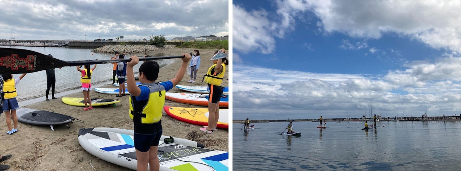 海を楽しみ、海を身近に感じてもらおうと、アクティビティとして初めてのSUP体験をしました。ほとんどの子どもたちがSUPは初体験でしたが、すぐボードの上に立つことができていました。子どもたちからは、「もっとやりたい!」という感想が聞かれました。また講師を務めた、いわき市海岸保全を考える会の代表・小林祐一朗さんは、最後に海洋ごみの問題に触れ「福島の美しい海を守るために、みんなもできることから協力してほしい」と子どもたちに呼びかけました。
