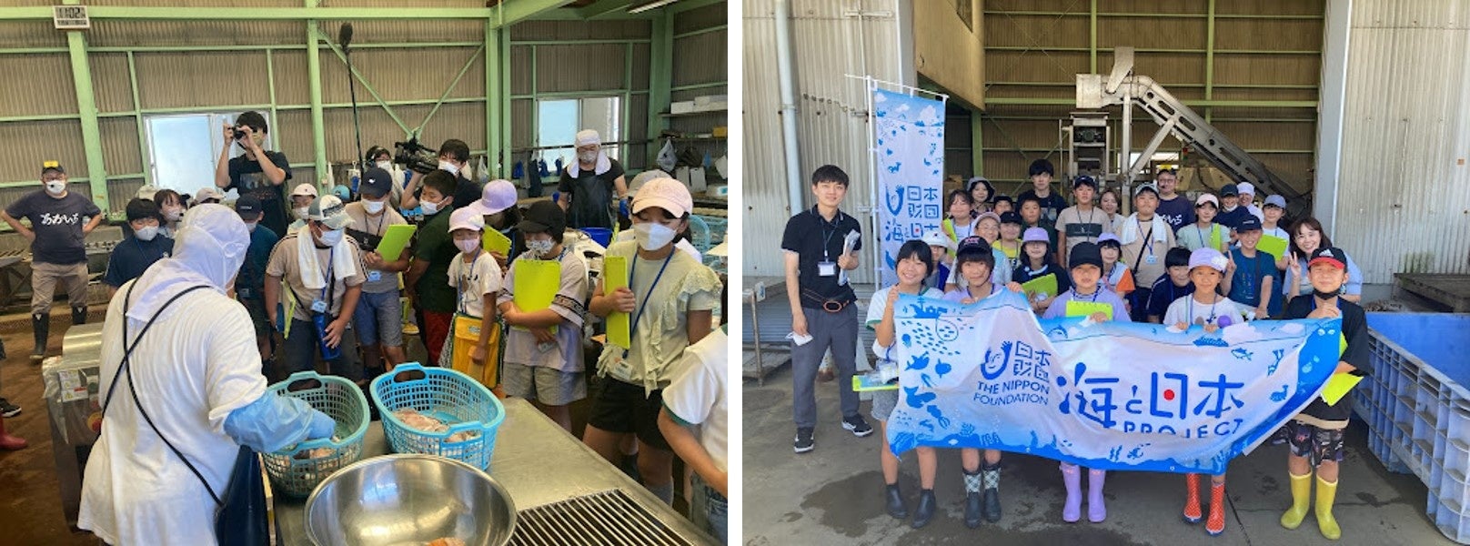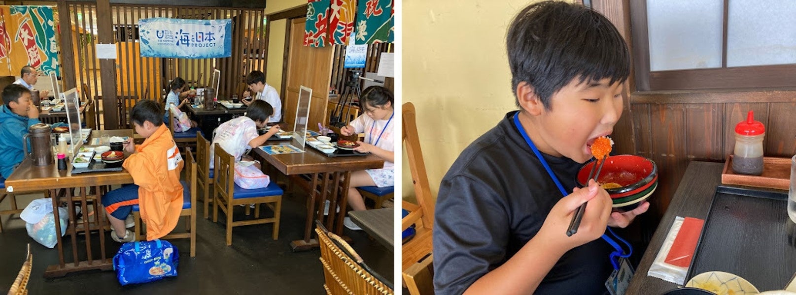 1日目の昼食は「ふくしま潮目の海 御膳」。このメニューは、いわき市の企業「潮目の駅 小名浜美食ホテル」が、豊かな海を未来につなぎ守っていきたいと、今回「日本財団 海と日本プロジェクト」とコラボし、考えたオリジナルメニューです。メニューには、いわき市の郷土料理「ウニ貝焼き」が乗った丼ものやいわき市の特産品「メヒカリ」を使った唐揚げなどが取り入れられています。子どもたちは、このおいしい海の幸を育んでくれる、豊かな海に感謝しながら、御膳を味わいました。「ふくしま潮目の海 御膳」は、期間限定で一般の人も食べることができ、「潮目の駅 小名浜美食ホテル」で、2022年9月11日まで提供されています。