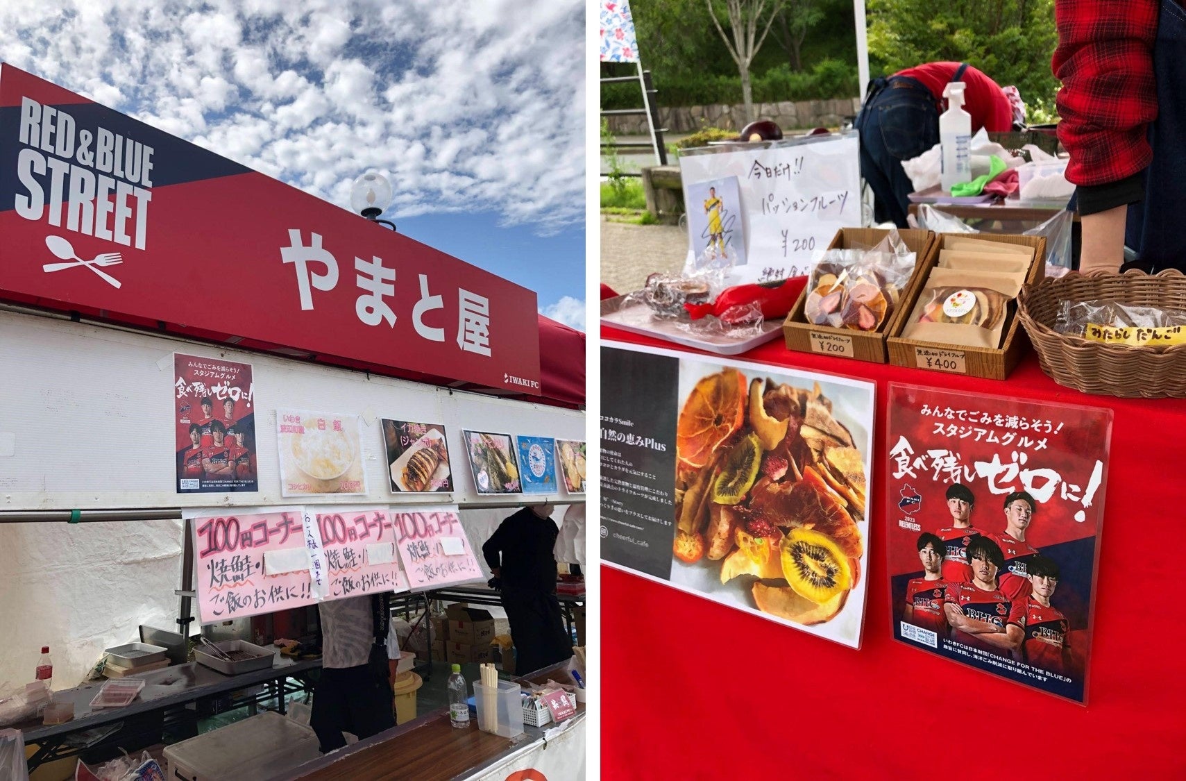 スタジアムに出展しているキッチンカーや引力店のブースに、いわきFCの選手をデザインにした「食べ残しゼロ!」のPOPを掲載。ごみを「減らす」という意識付けの啓蒙活動になりました。