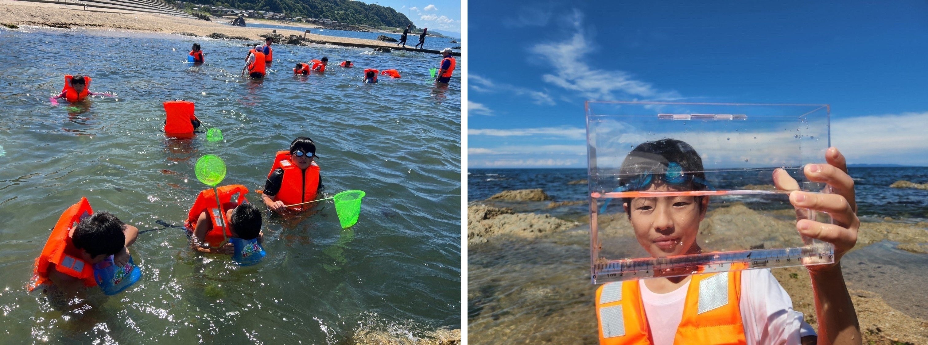 なかなか日本海に行くことがない埼玉県の子供達。まずは安全のために気を付けることを伝え、その後、木持先生から生き物調査の方法を教えてもらい、網や箱眼鏡、観察ケースを用いて生き物を見つけて観察しました。また、田中先生から砂浜に落ちているごみの説明をしてもらい、日本海と太平洋の違いについて解説してもらいました。外国からのごみも多いということを学びました。また、「自分が海で泳いでいるときにどこかの国からごみが来たら嫌だし、自分が違う国にごみを流すのも嫌だなと思いました」という子供の感想も聞けました。