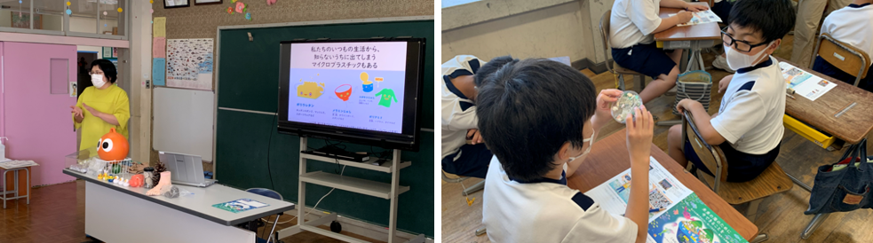 子どもたちに、「海洋ごみ」をより身近な問題として自分事に感じてもらい、自分たちにできることが何かを考えてもらうため、オリジナルの教材(動画・パンフレット)を使用し、県内の小学校8校、10クラスで出前授業を実施しました。