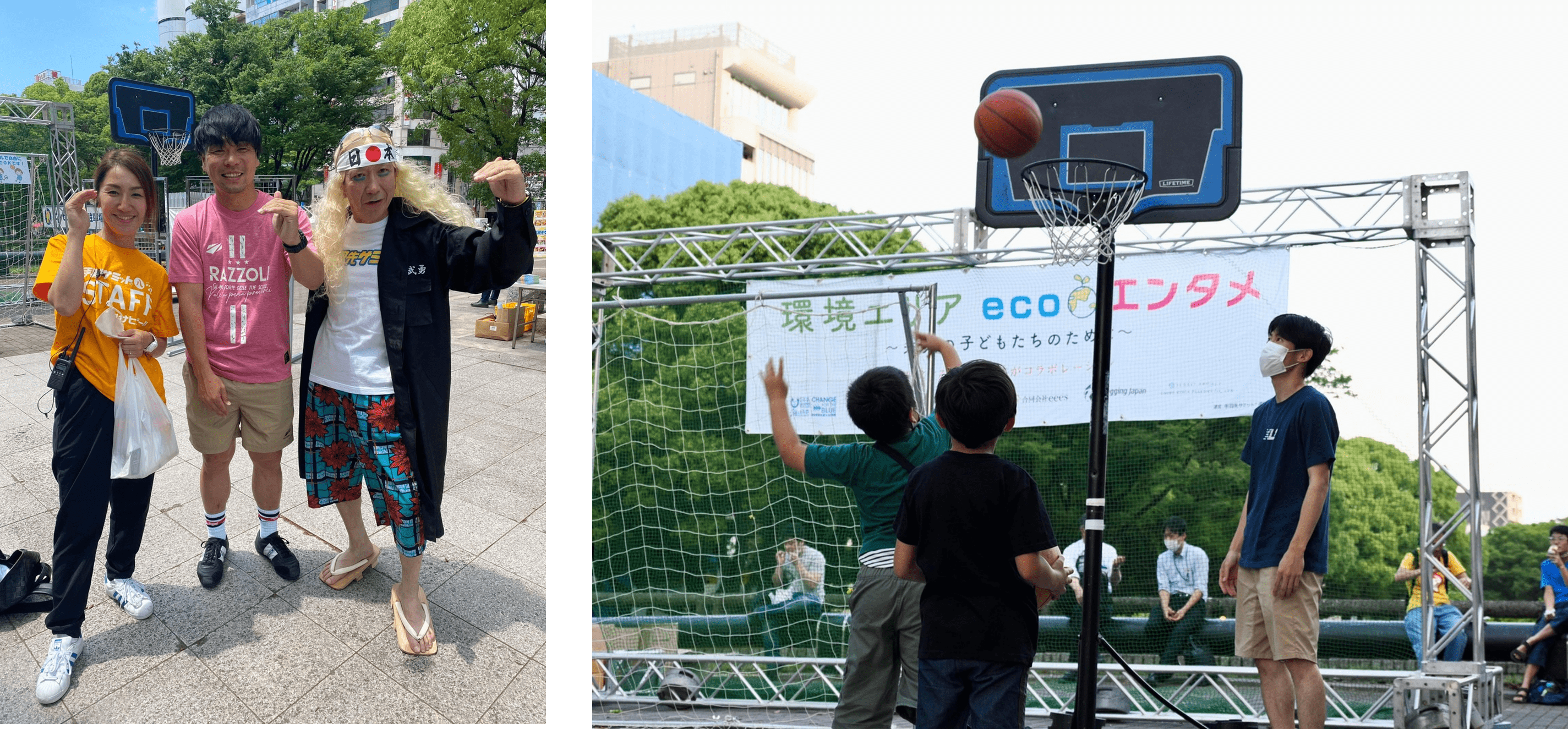 また、バスケットフリースローチャレンジでは多くの家族連れが楽しんでいました。バスケット、サッカーゴールの後ろには土に還る生分解性の布でできた横断幕を掲げました。