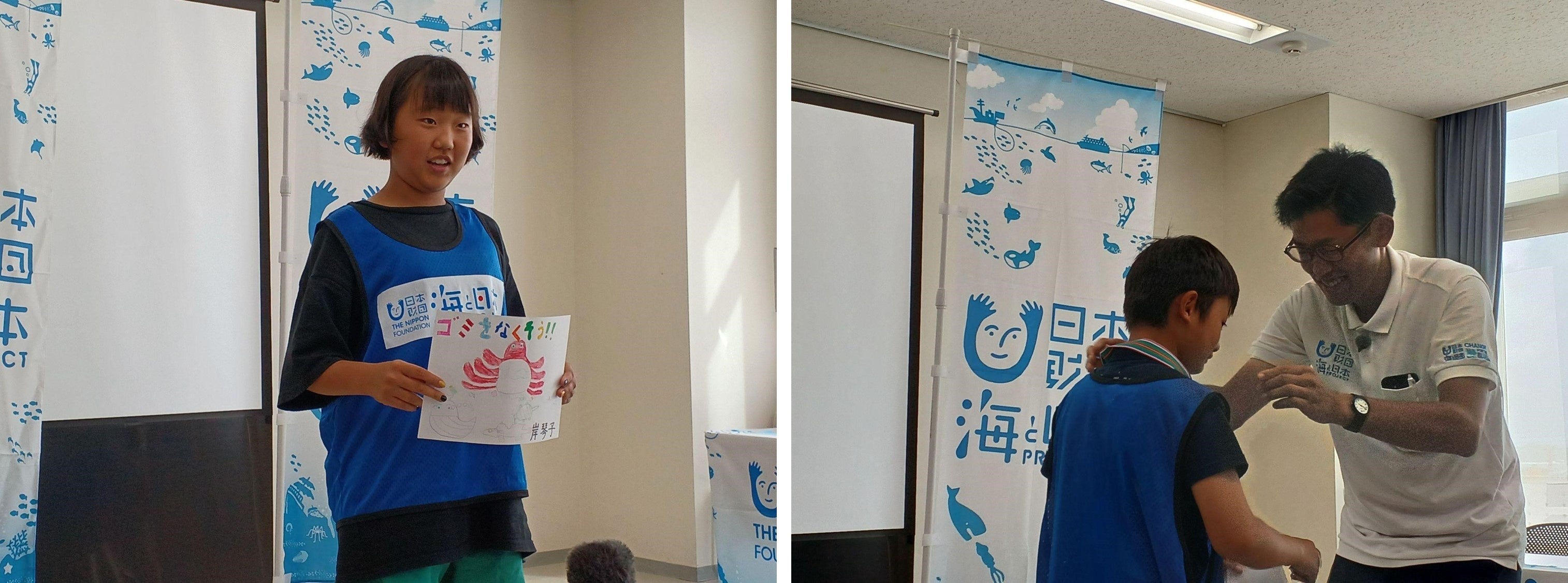 書き終えた後、順番にみんなの前で自分の「理想の三河湾」の絵を一人ひとり発表。学習ツアーの修了としてメダルを首にかけてもらいました。