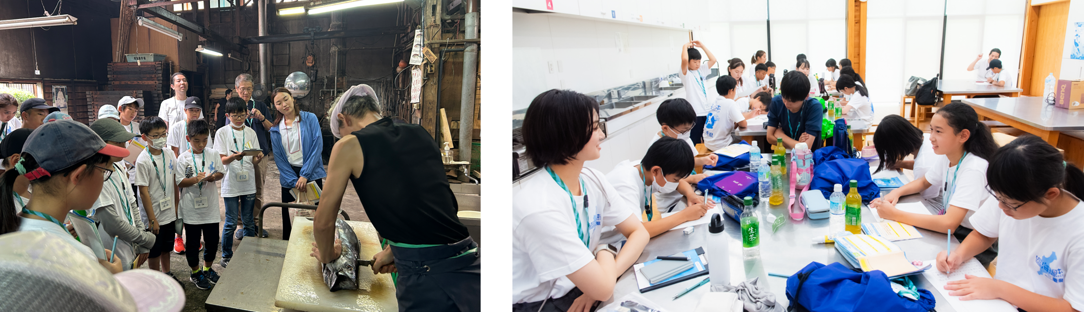 その後、近年の尾鷲の海における魚の種類や漁獲量の変化についても学び、この土地の循環にも大きな変化が生じていることを知った子どもたちは、地域の人たちがその海の恵みをどのように活用してきたのかを学ぶため、魚介類の加工品の製造・販売を行う明治35年創業の「大瀬勇商店」へと向かいます。