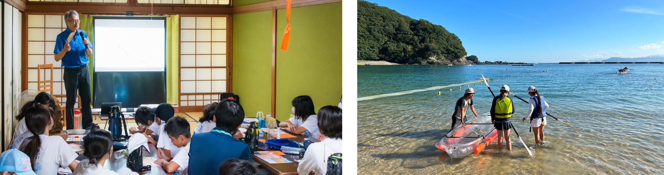 雨についての様々なメカニズムを学んだ子どもたちは、雨を循環させる役割を担う川と海へ向かい、実際にその様子を取材します。水の透明度の高さで有名な銚子川では、山に降った大量の雨がろ過され、ミネラルを含んだ豊かな水が川を通じて海へ運ばれていくことを学びました。その後は、紀北町の城ノ浜ビーチからスケルトンのシーカヤックに乗って海へ。これまでの取材や学びを生かして海の上から尾鷲の地形を観察しつつ、海水温の上昇など海洋環境の変化によってもたらされた、ガンガゼという生き物の増加による磯焼けの様子などを、自分たちの目で見て取材し、このままでは豊かな尾鷲の海の環境が変わってしまうかもしれないという危機感を、子どもたちは身をもって感じていました。