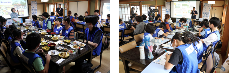 海のない滋賀県に、「鯖ずし」「鯖そうめん」といった海の魚である「鯖」を使った郷土料理が根付いています。1日目の昼食では、湖魚料理をはじめ「鯖ずし」「鯖そうめん」などいろいろな郷土料理弁当を食べて、一体なぜなのかを調査しました。初めて食べる料理が多かった児童もいたようですが、美味しかったという声が多数。特にビワマスの煮付けやえび豆。やはり甘さのある食べ物が人気のよう。でも、中には鮒寿司が美味しかったという児童も。