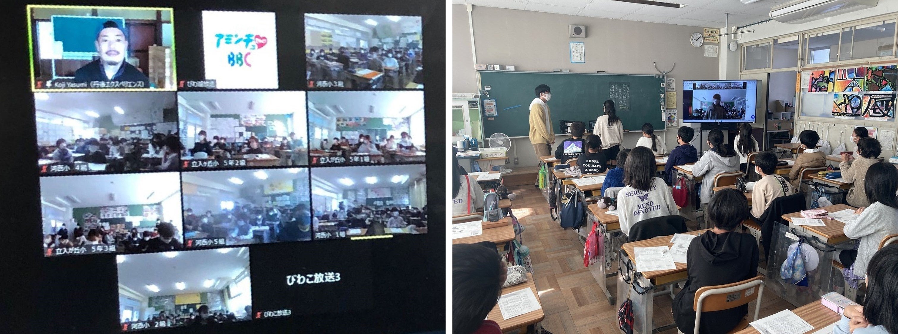 プラスチックリサイクルの活動を行う八隅孝治さんと各クラスを中継で繋ぎ、京都府京丹後市の海洋プラスチックごみの現状や、問題解決に向けた取り組みの紹介を受け、「みんなだったら、どうする?」というテーマでディスカッションが行われました。児童からは「清掃活動をする」や「プラスチックごみを出さないようにする」などの意見が出たほか、「八隅さんは海が好きで、海を大切にしたいという気持ちがよく分かった」「一人ひとりが行動することでごみを減らせるので、自分が行動するだけじゃなく、色んな人に広めたい」などの感想が述べられました。