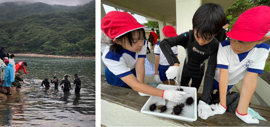 京都大学 フィールド科学教育研究センター舞鶴水産実験所の益田教授による京都大学舞鶴水産実験所前の舞鶴湾での潜水実演にて、採れた生き物や海藻の観察を行いました。子どもたちは、海で採れた生き物を教授から受け取り、実際に、生き物と触れ合いました。