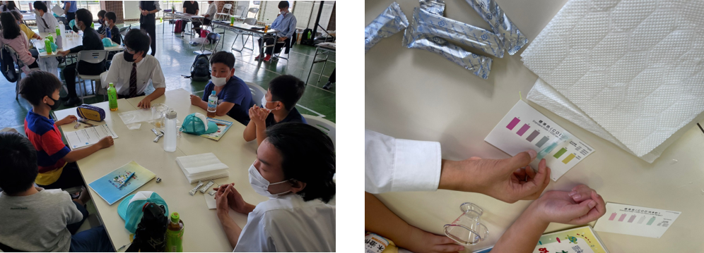 その後、桃山学院中学校高等学校の学生講師との実験では、みそ汁1杯を捨てたときにその水の中で魚が生きられる環境に戻すには、およそ浴槽1杯分の水が必要であるということを学びました。計算が必要な実験で苦戦していた小学生もいましたが、水を浄化するにはとても大変なんだということを実感できるプログラムとなりました。小学生にとっては中高生の年の近いお兄さん、お姉さんたちに教えてもらうことによって理解しやすいプログラムになりました。