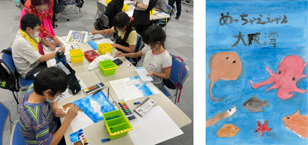 小学生たちはこの2日間で学んだことを大阪湾PRポスターとして制作しました。1日目の最初からポスターを描いてもらうことを子供たちにはアナウンスし続けて、この2日間体験してもらいました。この2日間のまさに集大成のこのポスター制作。講師に書き方を教わりながら、時間があまりない中にも関わらず、みんな素晴らしいポスターを作ってくれました。このポスターは、大阪の中心に位置する阪急梅田駅の構内のビジョンにて公開されます。