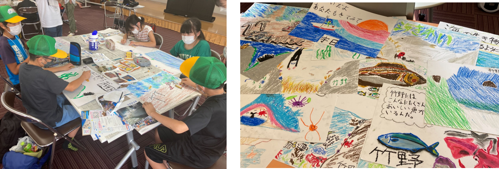 2日間座学と体験を通して竹野(日本海)の海の特徴や生物多様性、食文化を学んできた子どもたち、それぞれが思い描く理想の海と人の関わり方を絵で表現しようということで「うみぽす」体験をしました。