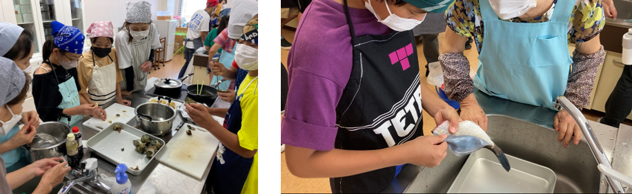 イベント中には竹野の食文化である「おしあげ料理」や「サザエご飯」の調理・試食を行うことで、生物多様性と食文化の繋がりについても学びました。