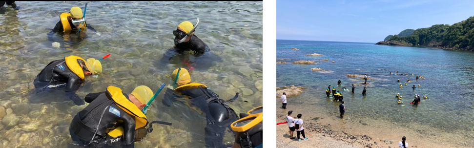 まず最初に、日本海の現状・課題・解決策について学びました。さらに、豊岡市竹野の海について、豊富な資源を活用する文化が育まれ、今もなお比較的豊かな生態系が保たれているが、近年ウニの大量発生による食害から磯焼け(藻場の減少)などが起き、サザエをはじめとした水産資源の収穫量減少が起きている現状について、以降の体験学習に繋げるための知識を得ました。