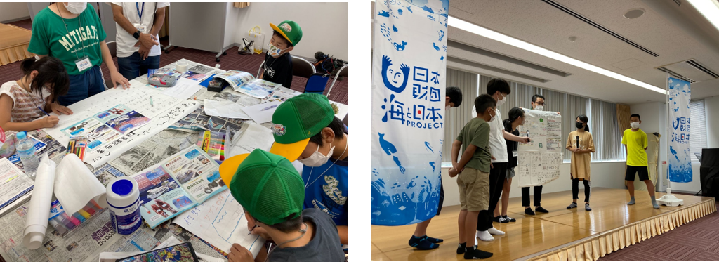 各班2日間を振り返りながら意見を出し合って資料をまとめ、最後にはステージに登壇しみんなの前で自分たちが学んだことを発表しました。「前に出れない、恥ずかしがり屋の自分を変えたい」という思いで参加していた子も最後には大きな声で発表できるまでになっていました。スタッフ一同、2日間という短い間での子どもたちの変化・成長に本当に驚かされました。「初めて知ることが多くすごく楽しかった。自分でもさらに勉強して、友達とかに広めていきたい」と語る子もいて、今回の参加者が発信者となり”ひょうごシーレンジャー”が増えていくことを願っています。