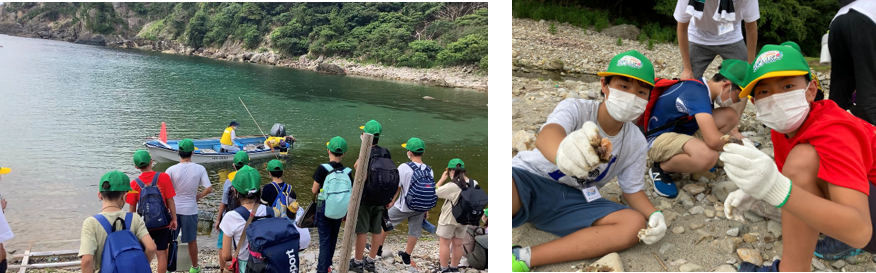 竹野では、生物多様性が育まれる環境があったからこそ、たくさんのサザエが収穫でき、サザエご飯を作る文化が形成されてきたことや地域特有の収穫方法である「磯見漁」について学びました。さらに、調理方法として竹野地域ではサザエを石で叩き割るということで、子どもたちも実際に体験しました。調理方法含め竹野の食文化を知った子どもたちの中には「帰って友達に教えてあげたい、そうすることでこの文化を守っていけたら嬉しい」と語る子もいれば、「この調理方法は臭すぎる」と嘆く子もいました。