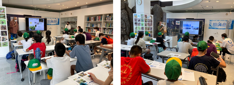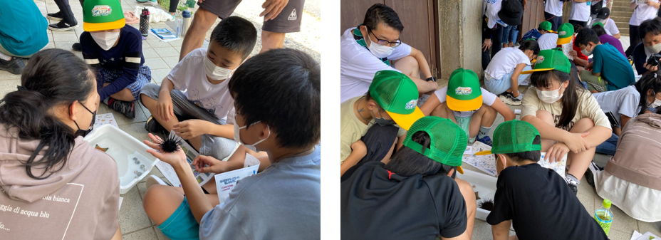 スタッフが捕獲した生物をタッチプールに入れ、自分たちで触れることで海の生物の特性について学びました。ヒトデをひっくり返すと元に戻る様に動くことやヤドカリがすぐに自分の殻を見つけて入ることなど、普段目にすることのできない生態を観察でき、子どもたちは終始興味津々。大人が触れるのを怖がっている中、子どもたちは自分の手に乗せて触感を楽しんでいました。「ヒトデは思ったより固い」そうです…。