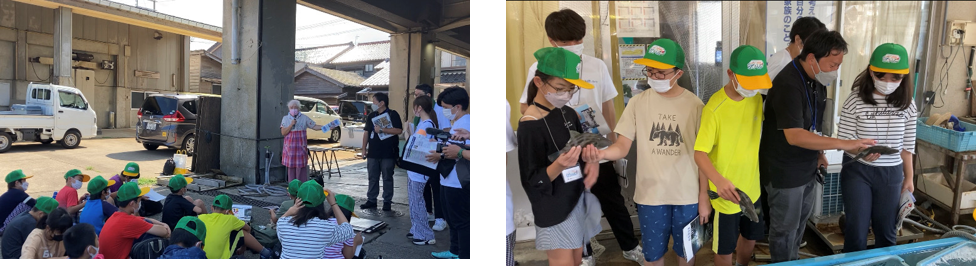 1日目より広い海(日本海)の生物多様性を学ぶため、日本海特有の漁法や獲れる魚を教えてもらい、実際に収穫された魚も見ました。カワハギを初めて手に取った子どもたちは「表面が触る向きによって、ザラザラしていたり、滑りがよかったりして不思議」とこの場でしかできない体験・学びができた模様。地元で女将をしている浪華氏からは、「漁師不足が深刻、竹野の漁師になってください」という切実な願いに加え「海を守るためには森を守る必要がある」というお話もしていただきました。