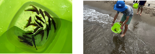 清掃活動を終えビーチを綺麗にした後は、子どもたちに海の生き物を大切にする気持ちを育んで欲しいと、「キジハタ」の稚魚を放流しました(西部会場は台風接近のため中止)。「キジハタ」は鳥取県内で多く水揚げされ、地域によっては「アコウ」や「アカミズ」などの名前でも親しまれる魚です。子どもたちは裸足になって波が来るタイミングを見はからって放流しようとしますが、足に水がかかって大はしゃぎ!「大きくなってねー」「また、戻ってきてねー」と、バケツに入った「キジハタ」の稚魚を海に放流し、大海へ泳ぎ出した小さな魚たちを見守っていました。