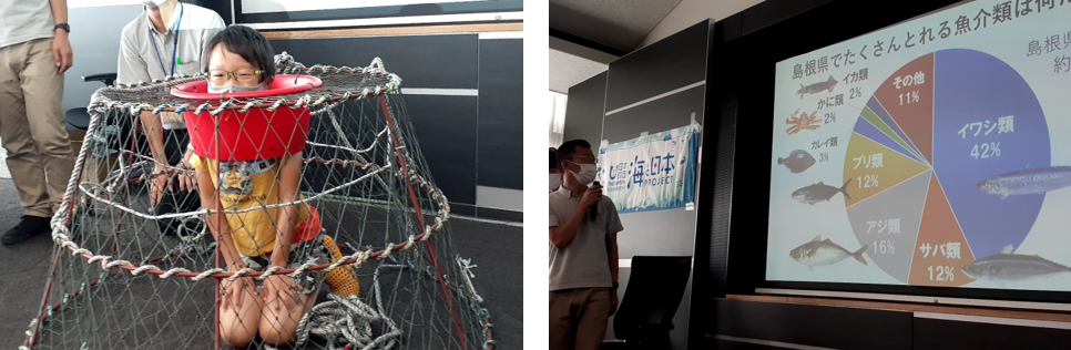 7月9日(土)は、島根県の漁業についての学びからスタート。島根の漁業には、まき網漁、定置網漁、さし網漁、はえ縄漁、いか釣り漁、採介藻漁、カニかご漁、ワカメ養殖などがあり、”獲る”漁業が中心であること、そして全国トップクラスの漁獲量を誇るアジ、アナゴ、カレイ、ブリなど多種多様な魚が採れることを学びました。会場には、ズワイガニ漁に使う「カニかご」が用意され、探検隊は中に入ってその仕組みを体感。「カニはなぜかごに入ってくるのか?」「カニは逃げないのか?」メンバーからたくさんの質問が飛び出しました。