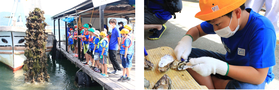 最後の学びは、瀬戸内海の漁業について。生産量日本一を誇る呉市のマガキ養殖を中心に学びました。養殖中のカキを目の当たりにしながら説明を受けた後は、カキを剥く作業に挑戦。熟練者のカキ剥き作業はわずか5秒の早業と聞いた探検隊、初めてのお仕事体験に真剣そのものですが、約1分でようやく1つ剥くことができました。