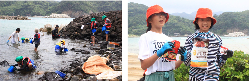 海洋ごみにも驚きがありました。なんと瀬戸内海では、海洋ごみを”探し”ました。日本海では、ごみは拾いきれないほどたくさんありましたが、瀬戸内海の体験会場では海洋ごみは少なく、しかも外国のごみは見当たりません。生き物について、ごみについて、なぜ違いがあるのか?みんなで考えました。干満差が大きいから?海岸の成り立ちが違うから?閉鎖性が高いから?海の環境が違えば、生き物も海洋ごみも全然違う!子供たちは一つ一つを全身で体感していきました。