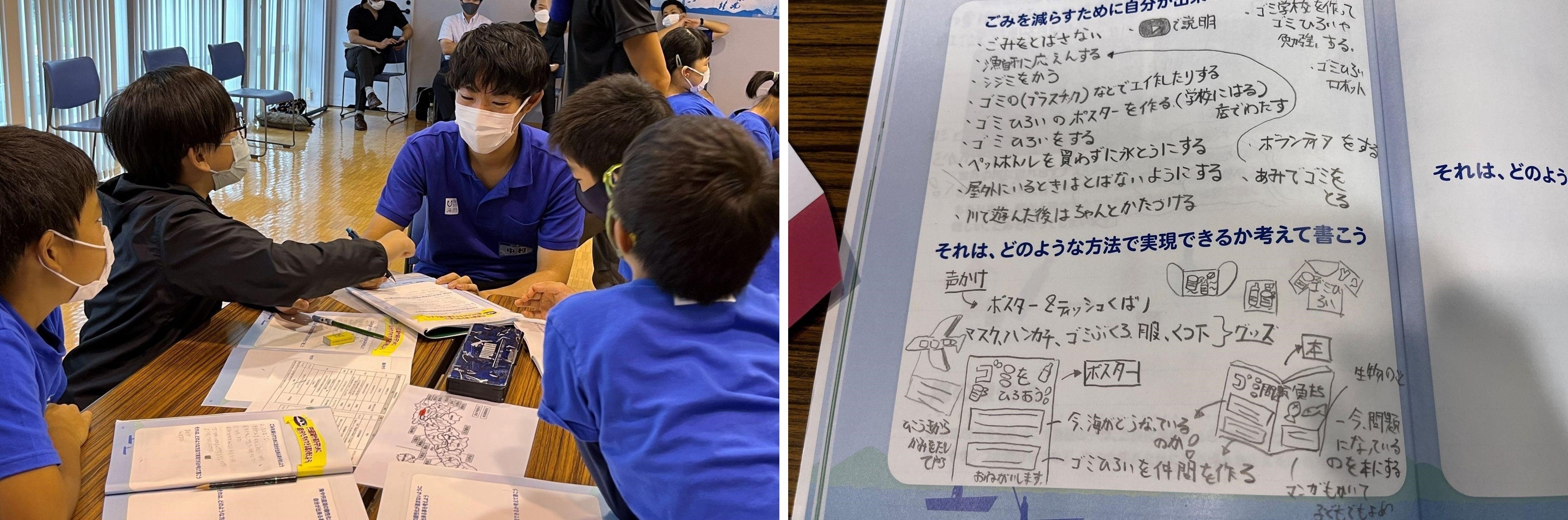 宍道湖のごみを調査して、グループごとに見つけたごみを発表しました。宍道湖のごみはやがて海に流れ出し、海洋汚染につながります。ごみ問題についてグループで話し合うと、白熱したディスカッションが繰り広げられました。海のごみ拾い専門会社やごみ拾い大学の設立、飛行機や車のラッピング、人が集まる夏のイベントで訴える、3Rの徹底など様々なアイデアが飛び交い、議論は尽きません。大人が驚くほどの熱気が漂いました。