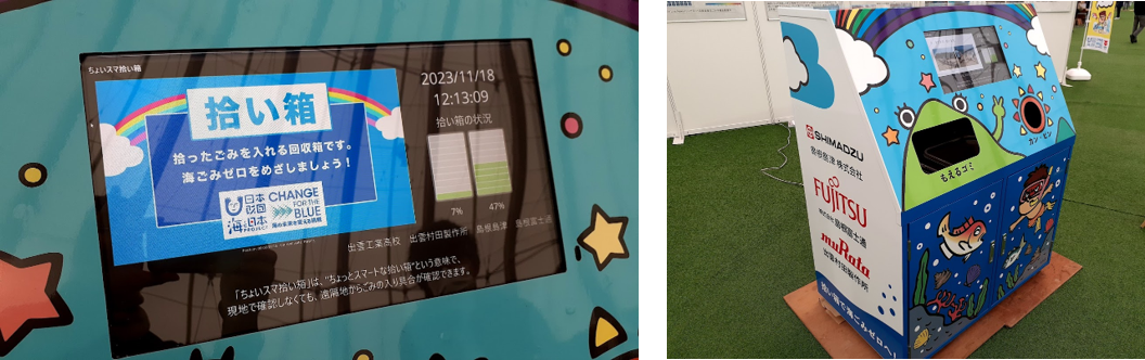一般社団法人海と日本プロジェクトinしまねは、島根島津株式会社、株式会社島根富士通、株式会社出雲村田製作所、出雲工業高等学校、出雲市環境政策課と連携し、「ちょっとスマートな拾い箱」を制作。2023年11月18日に島根県出雲市の出雲ドームで開催された「いずも産業未来博」にてブース出展し、お披露目しました。