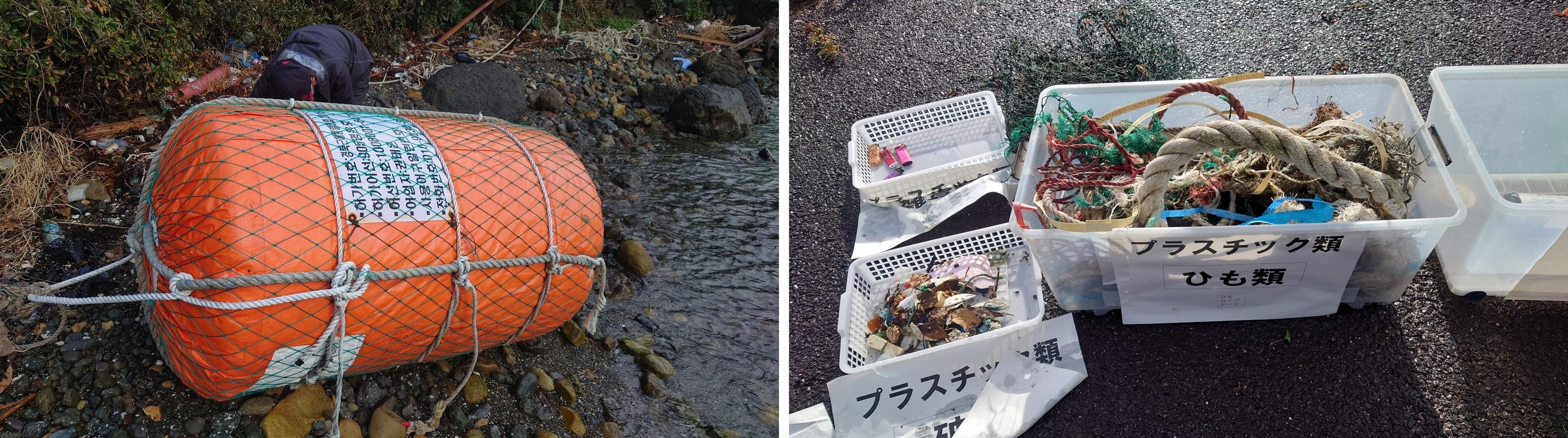 普段人が入りこまない場所のため、土に埋もれ回収が難しいごみもありました。プラスチックごみが目立ち、ごみの大半は日本国内の物のようでしたが、韓国語や中国語の表記があるペットボトルも目立ちました。国内外の魚網やブイなど、漁具も多く見つけました。