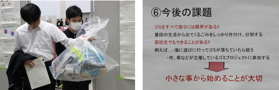 「海ゴミを拾って、海をきれいにして紹介する」チームは、「世界規模で海洋ごみが増え続けている現状に注目してこの探求分野を選んだ。海洋ごみ調査の結果を、実際のごみや写真で紹介することにより、自分たちがしないといけないこと、きれいな海を守っていく気持ちを啓発する。国内外からごみが漂着しているが、あきらかに国内のごみが目立ち、ポイ捨てが多いと感じた。この探求を行い、次の生徒や多くの方に伝えたいことは、ごみを拾うということはもちろん大切だが、ごみを捨てないことが大切で、啓発活動により、多くの方に地球環境、海洋ごみ問題の深刻な現状を知ってもらいたい。」と発表しています。