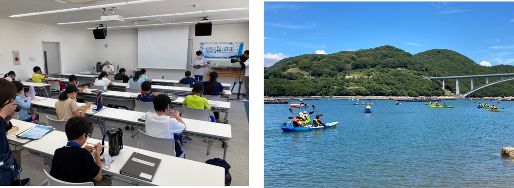 シーカヤックで海を楽しんだ後は、海のゆりかごと呼ばれる「アマモ場」について学習しました。講師には備前市の今ある資源を活かし、持続可能なまちづくりを推進する活動を行う一般財団法人みんなでびぜんの川股忠正さんに登壇していただき、魚を守る取り組みとして実施しているアマモ場再生活動について教えていただきました。子どもたちは座学のあと、実際に漁船に乗って日生町が再生活動に取り組むアマモ場を観察しました。講師には、アマモ場の大幅な消失などの過去の失敗例も教えていただき、今までに人がしてきた過ちによる環境変化とその影響について知り、その反省を活かして実施している現在の取り組みやその成果などを学びました。