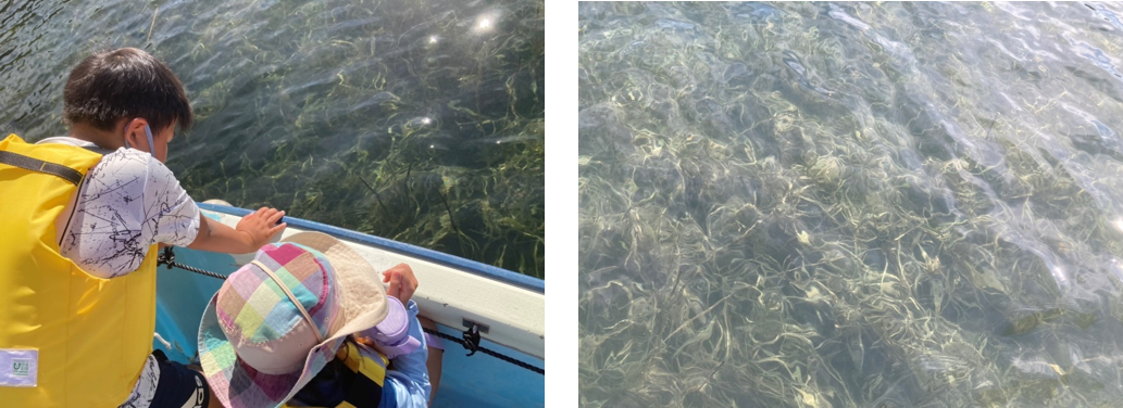 子どもたちは、船の下に広がるアマモ場を実際に目の当たりにし、みんな一生懸命に魚を探していました。「すごく減ったアマモの量がこんなに回復していることがすごい」や「同じ失敗を繰り返さないようにアマモの大切さを伝えていきたい」などの声が聞かれました。それぞれがこの体験学習を通して、生き物の住みかであり、餌場であり、隠れ場であり、産卵場であるアマモ場の多様な役割を学ぶと同時に、岡山の魚介類はこれからの取り組み次第で取り戻せるものだと認識してもらえたようでした。