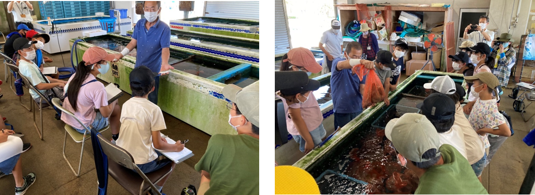 その後、場所を岡山県農林水産総合センター水産研究所に移し、つくり育てる漁業「栽培漁業」について学びました。講師には農林水産総合センター水産研究所林副所長に登壇していただき、まずは水産研究所を見学し、エビの種苗飼育、オニオコゼの中間育成観察、種苗のエサ飼育などを実際に巨大な水槽を間近で観察しました。なぜ「栽培漁業」がおこなわれるようになったか、養殖ではなく栽培漁業である理由、今後の取り組み等について学びました。子どもたちは、魚を獲りすぎた過去の失敗とその影響を知り、また、「養殖」ではなくつくり育てる「栽培漁業」という取り組みとその考え方について学んでいただきました。