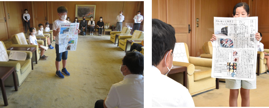 山口県庁に村岡嗣政を訪ねたぶち海体験隊の代表4人は、手作りの新聞で学びの成果をプレゼンしました。岡田悠里さん(山口市立大殿小学校5年)は萩の豊かな海はマグマの活動によって生まれたこと、その海がもたらす恵みのうち、特に高級イカのケンサキイカは全国でも有数の漁獲量を誇ること、藤井雅大君(山口市立上郷小学校5年)は、地元の萩市須佐では地名の由来となった須佐之男命伝説から活イカを須佐男命イカと命名し、ブランド化を図ることで豊かな海をさらにイカす取り組みを進めていること、田村心音夏さん(山口市立大内南小学校5年)は、イカの漁獲量は年々減っていて、寿命が1年と短いため環境の変化を受けやすく、生き残りに失敗するとその年の資源量に大きく影響することなどを報告しました。