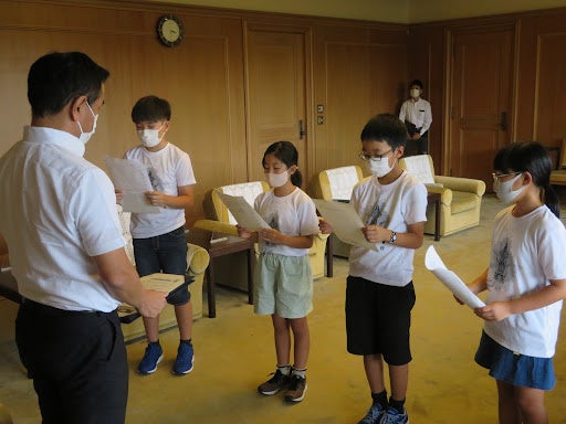海と日本プロジェクトinやまぐち実行委員会は、県内の小学5・6年生20人と「ぶち海体験隊」を結成し、特産のケンサキイカを通して海の豊かさと現状を学び、海の未来を考えることを目的に、イベント「ぶち海体験隊Ⅲ イカす海を未来に!」を7月3日(日)と7月29日(金)に開催。隊員の代表4人が山口県の村岡知事に報告しました。
