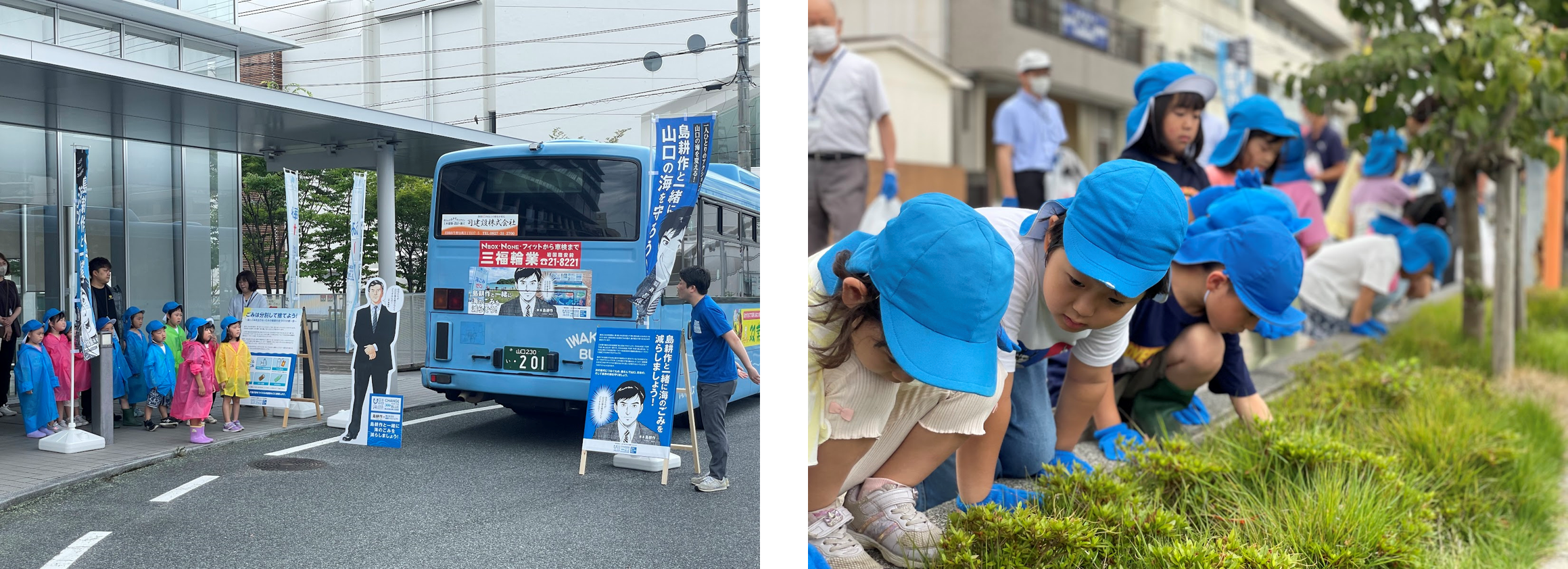 一般社団法人山口・海ごみゼロ維新プロジェクトは、7月3日(月)から山口県岩国市のバス会社・いわくにバスと連携し、人気マンガキャラクター「課長 島耕作」が海洋ごみゼロを呼びかける啓発ポスターを車体後部に掲載したバスを走らせています。運行初日の7月3日(月)には、岩国市のバス会社の社員や地元の園児、市役所の皆さんとバスの出発を祝う出発式と市内のごみを拾うイベントを開催しました。