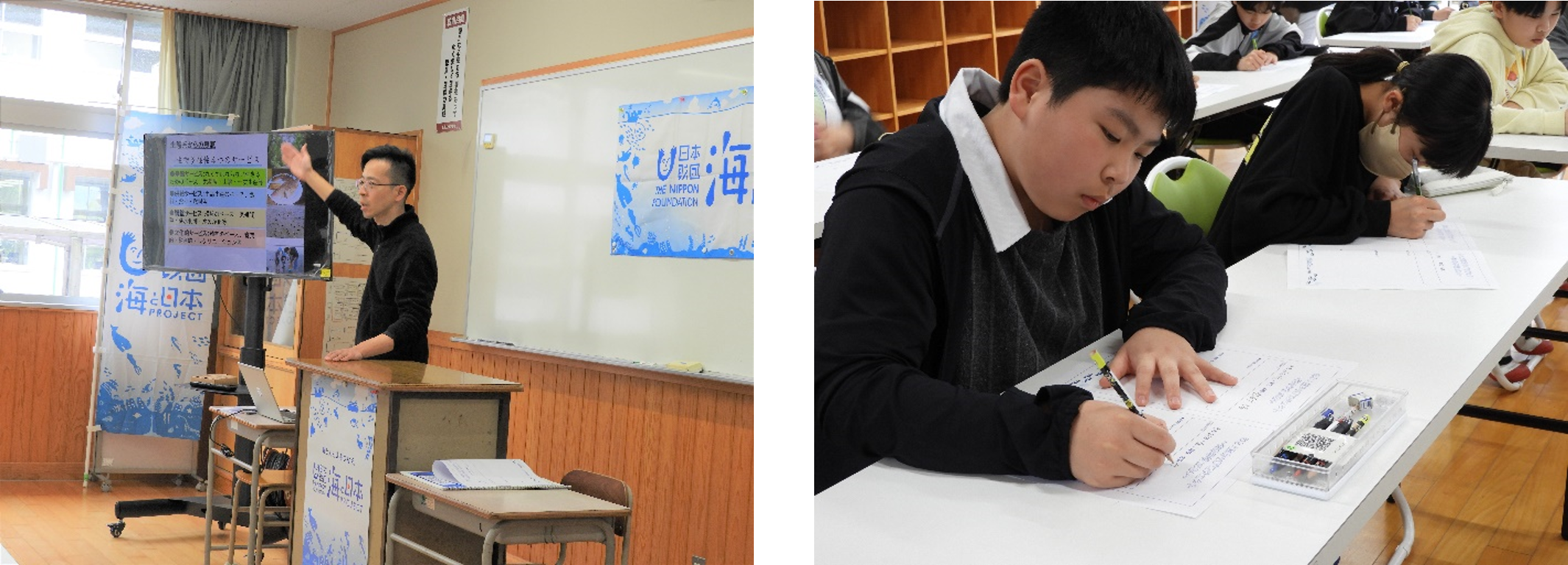 1回目となるプログラムは、総合的学習の時間(3~5時限目)を使って「山・川・海の繋がり」をテーマにした授業を実施。まず初めに、これからの学びについてオリエンテーションを行うと、海洋学習に興味津々の子どもたちは目を輝かせ、今後の活動を楽しみにしている様子が印象的でした。