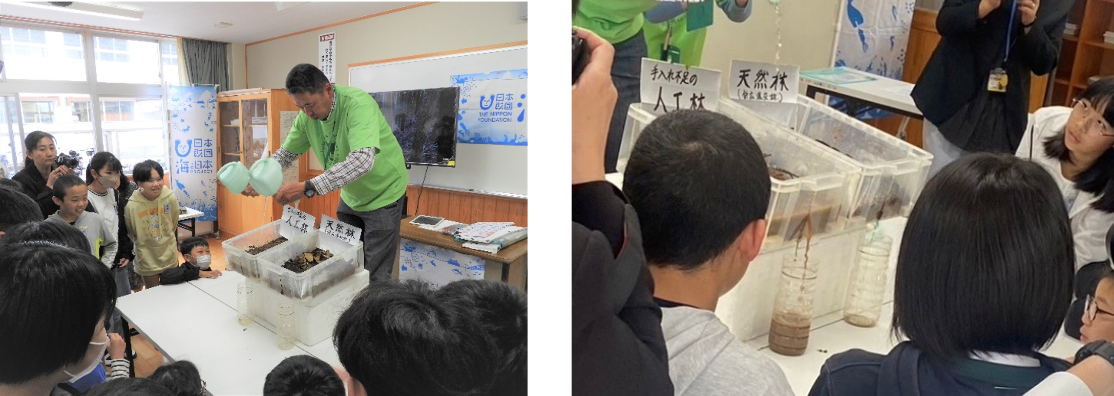 宮崎県の山は60%が人工林とされており、そのうち70%は手入れの出来ていない放置人工林とされています。下刈りや枝打ち、間伐などの手入れをしていない人工林は木が密生し、これにより地表に陽の光が届かなくなり、地表に植物は生えず、土がやせて栄養豊富な水が川や海へ流れていかなくなります。そこでこの授業では、天然林の土と人工林の土を使った保水実験を行いその違いを子どもたちと体験しました。実験方法は、同じ量の土と水を用意し、天然林と人工林それぞれの土に水を流していきます。結果は一目瞭然で、天然林の土の保水力の高さが明らかになりました。子供たちもこの実験結果から、土の役割についてより理解を深めることができました。