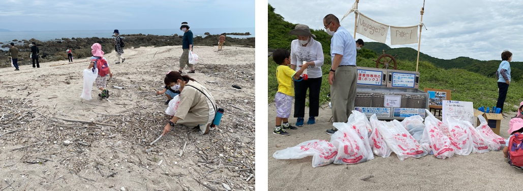 5月28日(土)より白浜海岸でいちき串木野市オリジナルの拾い箱「ボイジャーズポート」の運用を開始するとともに、地域住民の方と一緒にキックオフ清掃活動を開催しました。清掃活動には、いちき串木野市の中屋市長をはじめ、地域住民の方など約40名が30分間ごみ拾いを行い、30Lのごみ袋およそ30袋分のごみが回収されました。参加した子供たちも、楽しみながらごみ拾いを行っている様子でした。終了後も率先して回収したごみの分別作業まで行い、海洋ごみ問題について興味を持った様子でした。