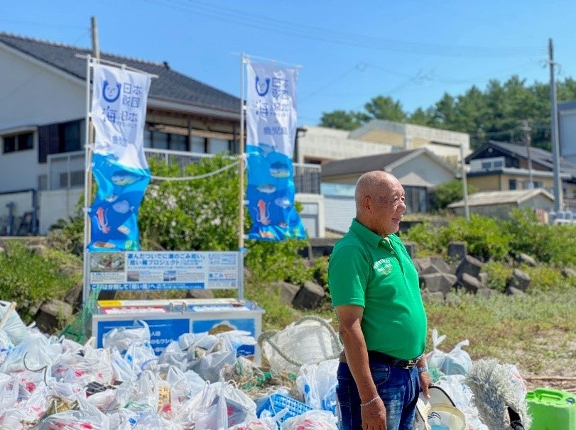 また照島海岸では、ボランティアの方々により、毎朝5時から11時くらいまでごみ拾い活動が行われています。今回、本活動を見た地域の方々の意向もあり、照島まちづくり協議会から「地区として海岸清掃に取り組むために海岸の美化活動や拾い箱の管理をしたい」とのことで、今回の設置に至りました。「拾い箱」のデザインには、地元いちき串木野市でおなじみのキャラクター「うんまかせんにん」が描かれており、「自然を壊すのはワシら人間。でも、守ることが出来るのもワシら人間。心も自然もクリーンが一番なのじゃ。心も自然もクリーンが一番じゃぞ」というメッセージ性の強い、照島オリジナルのデザインとなっています。